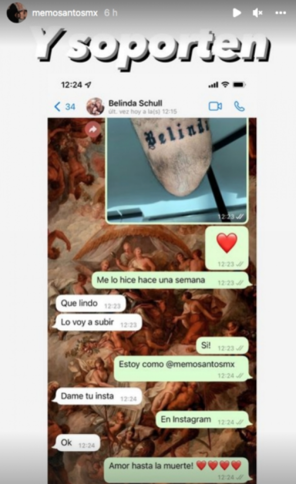 Mientras tanto, Belinda Schüll, madre de Belinda, presumió en redes que el “influencer” Memo Santos se tatuó en una pierna “Belinda”.