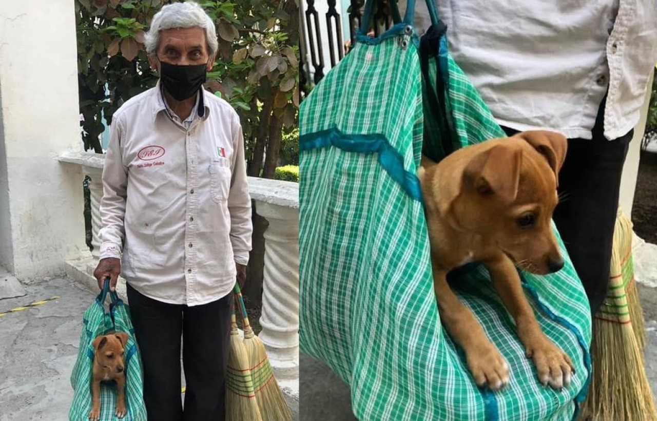 De acuerdo con al publicación, el señor rescató al perrito abandonado y para que no se canse, lo carga en un morral junto con su mercancía.