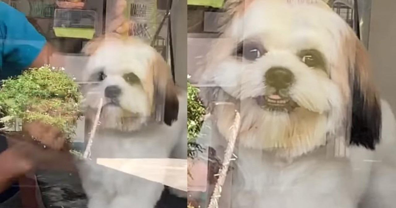El usuario John Sumugat publicó en su cuenta de Facebook un tierno video de un perrito al que están cortando el pelo en una estética canina, cuando se percata de que lo están grabando desde afuera y aprovecha para “sonreír” ampliamente”.