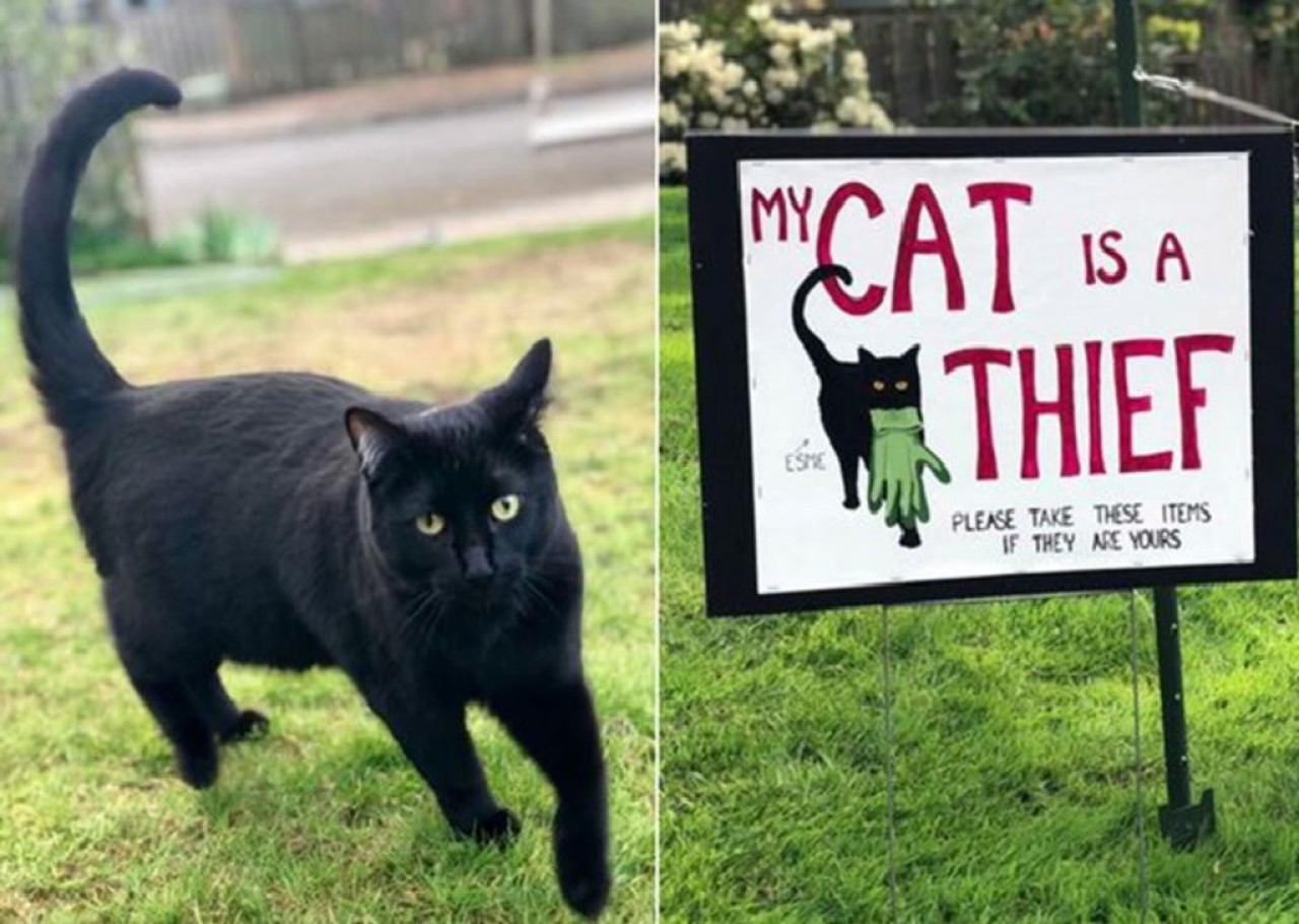 Kate Felmet decidió denunciar públicamente a su gato Esme por ladrón y lo hizo colocando una señal en su jardín, junto a la cual pone todas las pertenencias ajenas que su michi hurta de los vecinos para que estos las recuperen.