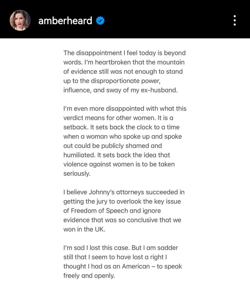 En un comunicado, la actriz expuso que siente “decepción más allá de las palabras. Tengo el corazón roto porque la montaña de evidencia no fue suficiente para encarar el desproporcionado poder, influencia y encanto de mi exesposo”.
