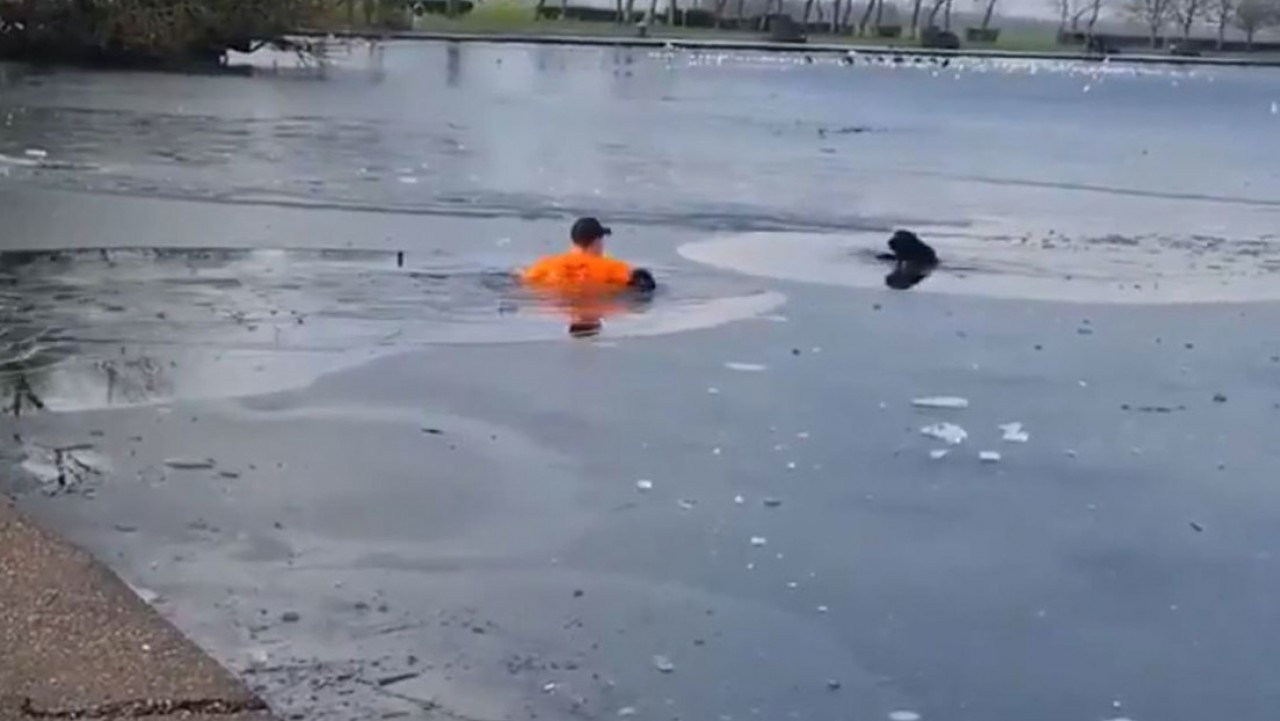 El hombre logró llegar hasta donde estaba el can, después de abrirse paso en hielo y se zambulló en el agua helada para llevarlo de vuelta a la orilla.