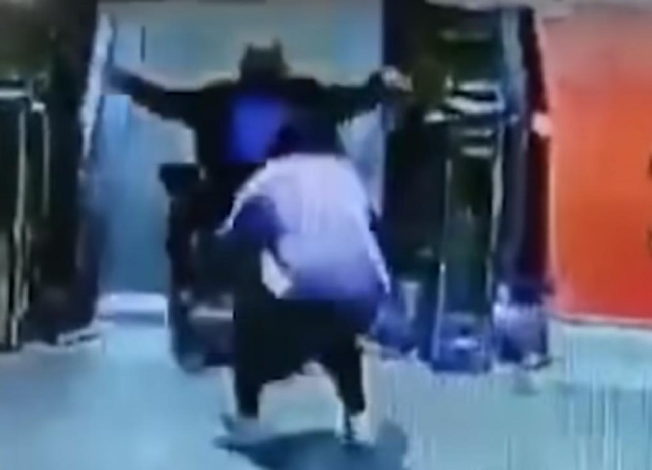 Sin importarle si resultaba herida, una mujer en una tienda en la provincia de Guizhou, China, se lanzó al rescate de un adulto mayor en silla de ruedas, que se deslizó sin control cuesta abajo por una cinta desplazadora.